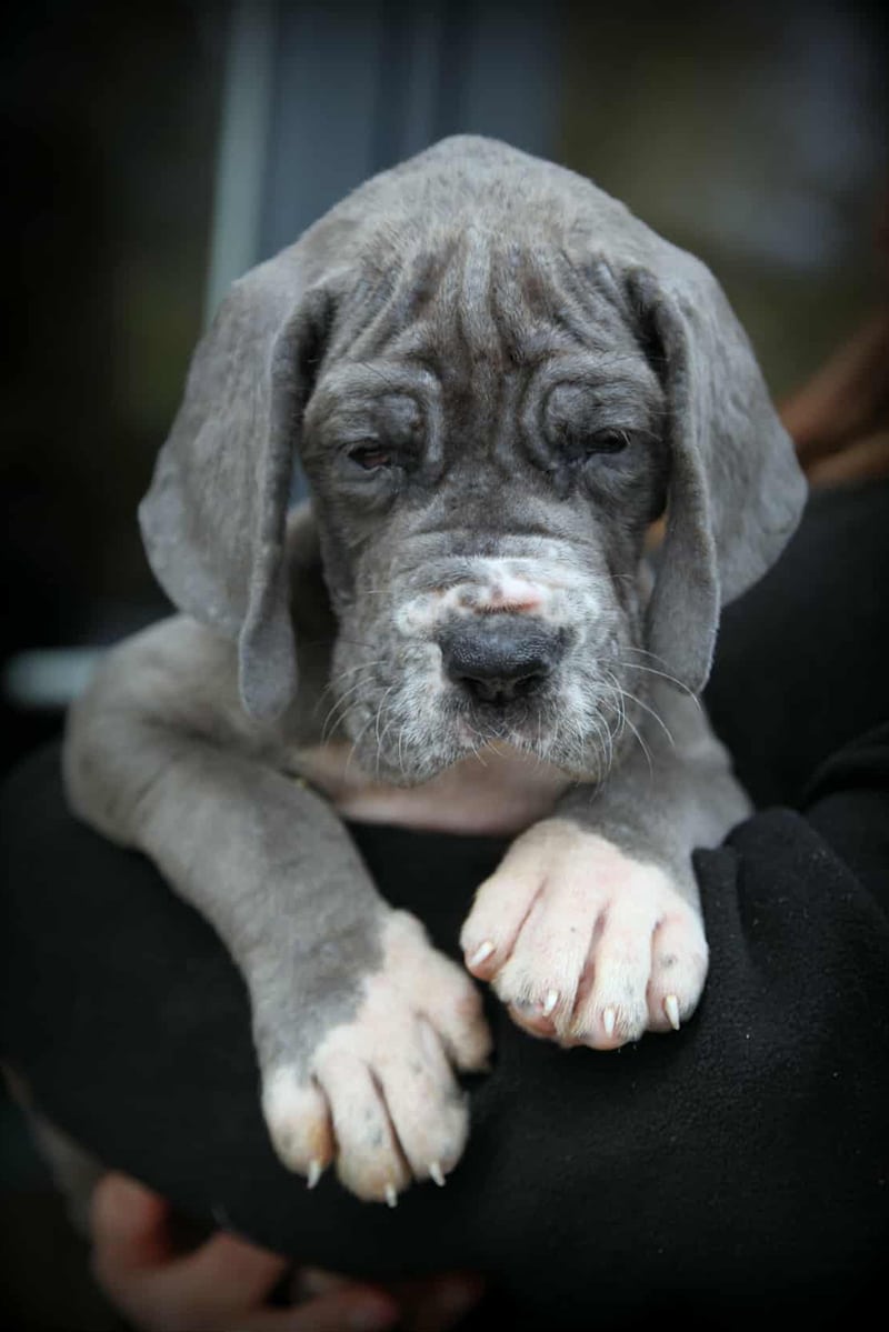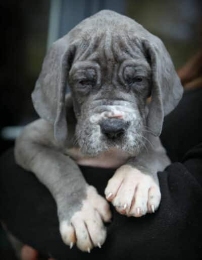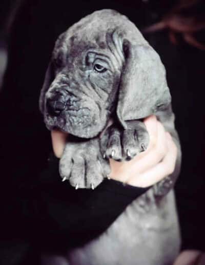 Depuis plus de 10 ans, je consacre mon quotidien à l’élevage de dogues allemands bleus, une race que j’ai découverte et adorée dès mon enfance. Leur prestance, leur regard expressif et leur douceur m’ont marquée à jamais. Ma toute première chienne, HÉRODIAZE des Géants de Becquigny, a été à l’origine d’une portée inoubliable de 14 chiots bleus, nés de son union avec HERMEIJ du Mont Toisé. C’est ainsi qu’est né mon élevage : Les Terres de Romandor.