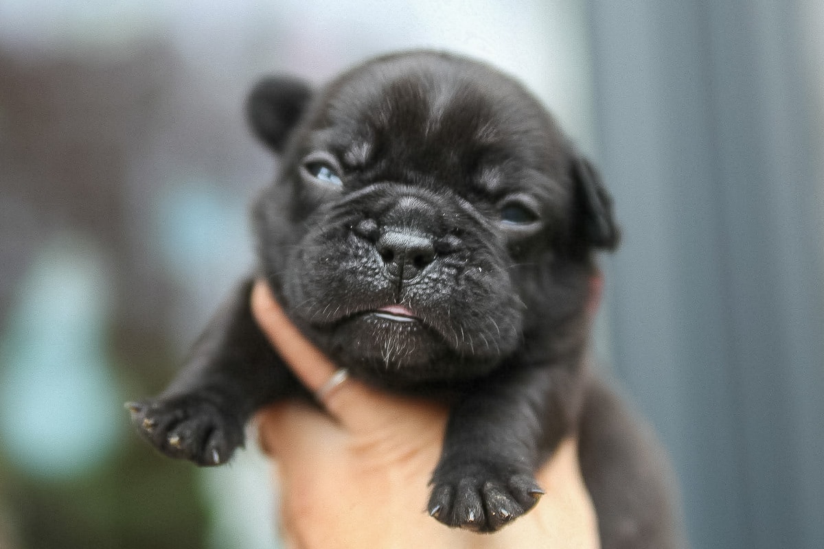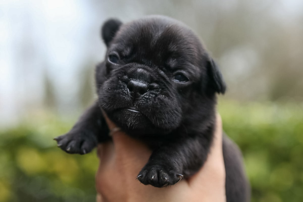 Ses yeux mi-ouverts, encore un peu ensommeillés, lui donnent cette bouille irrésistible typique des tout jeunes Bouledogues français. Quand on la tient dans les mains, elle se laisse aller complètement, comme si elle se sentait immédiatement en confiance.