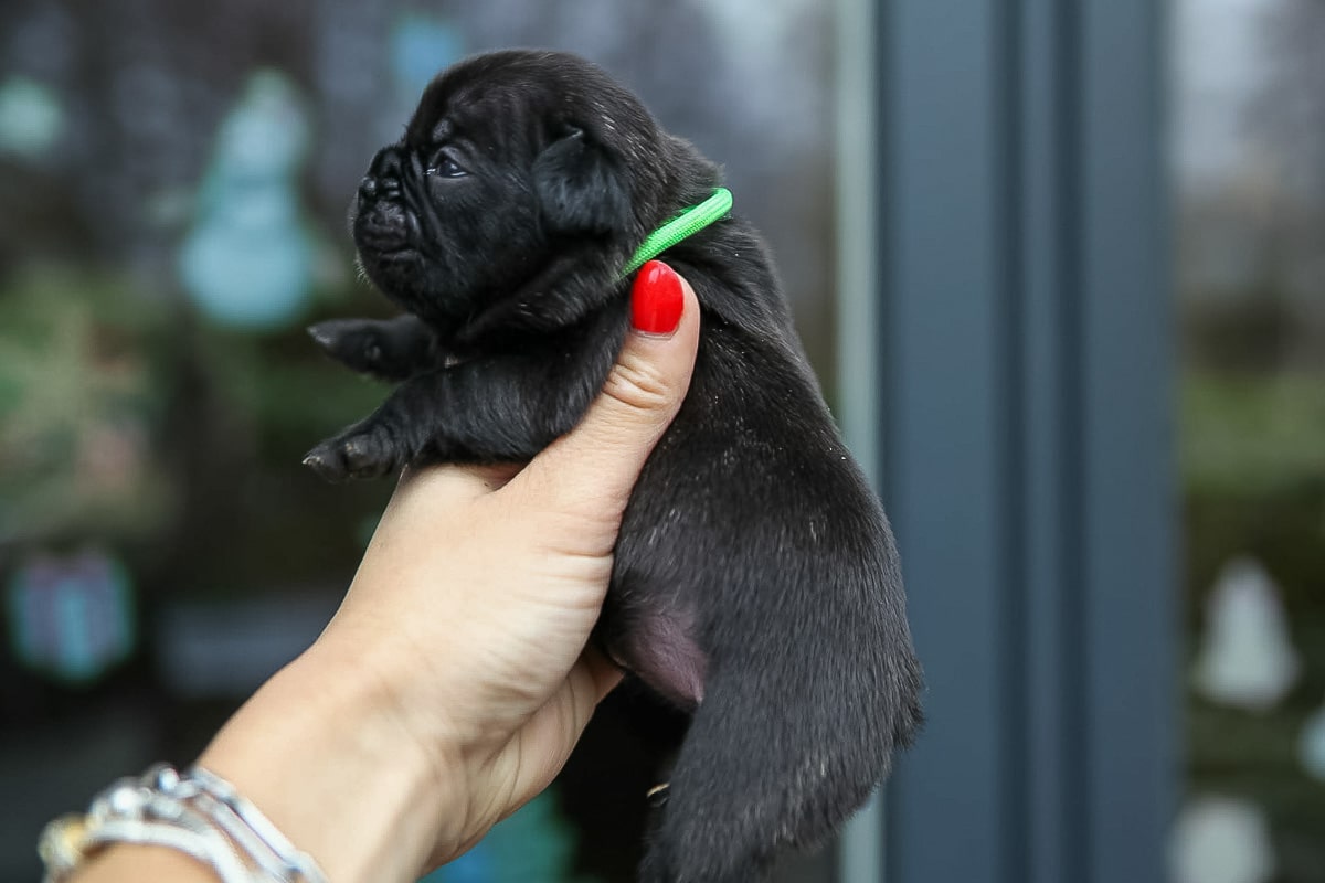 Avec son joli pelage sombre et son museau délicatement plissé, elle arbore déjà une expression pleine de tendresse… et un petit air malicieux qui fait craquer au premier regard.