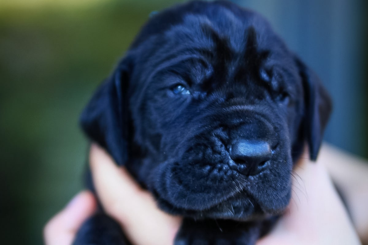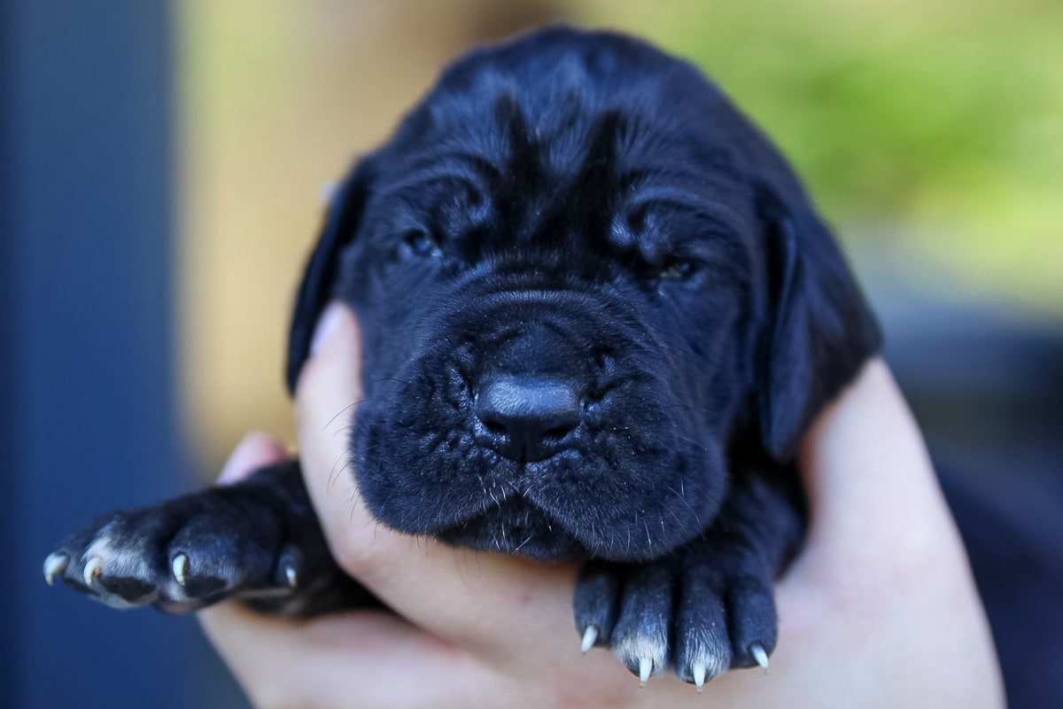 Avec son pelage noir profond et son regard encore un peu endormi, ce mâle au collier bleu dégage déjà une belle prestance. Derrière son air sérieux de petit prince se cache en réalité un chiot tendre, qui aime se blottir dans les mains et profiter des câlins.