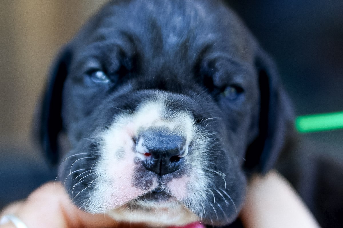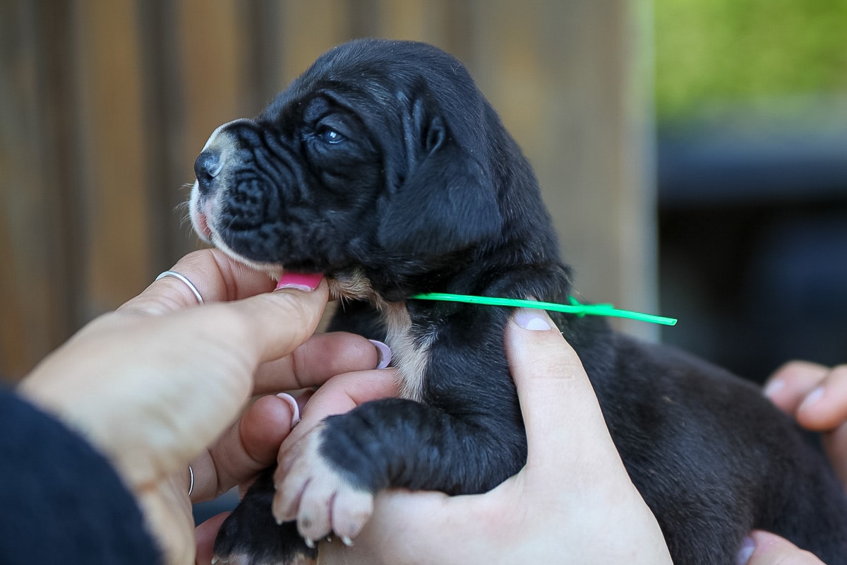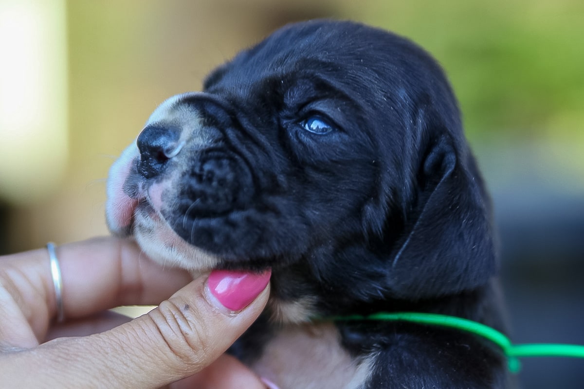 Ce beau mâle au collier vert arbore un pelage noir brillant contrasté par ses jolies marques claires, qui lui donnent une allure élégante et unique. Derrière son air sérieux et concentré se cache un chiot tendre, curieux et avide de câlins.